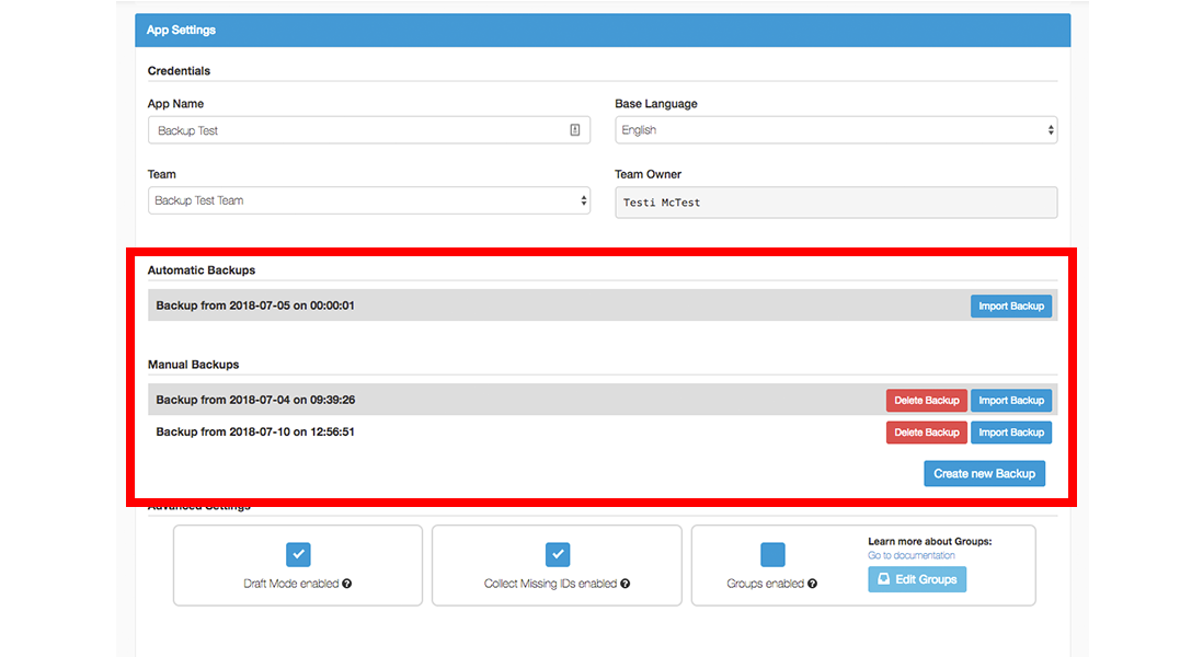 So far, we were always able to help our people to restore their translations, but we felt it was time to hand these tools to the user base for an even more convenient experience. With our last release, we added two ways to make sure you can revert whatever might go wrong: Automatic Backups and Manual Backups. You can access the backups per app on the Project Settings page.