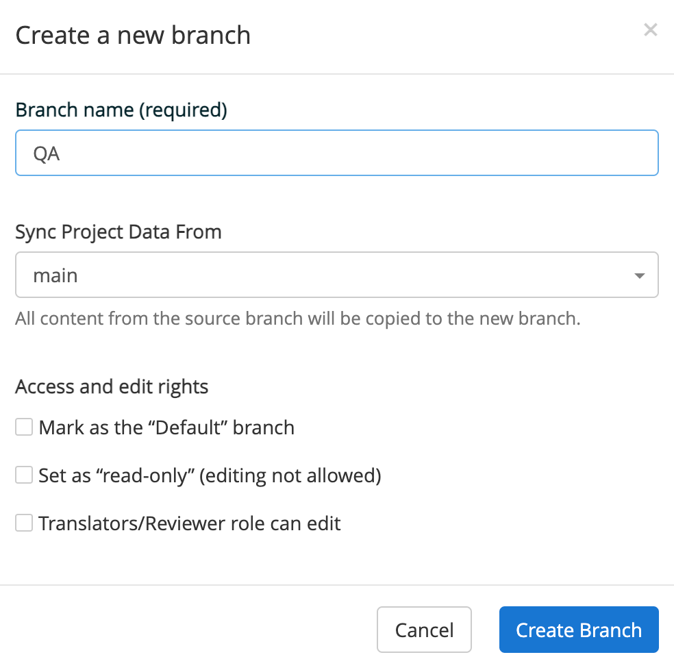To prevent changes to specific Branches, you can designate the Branch as Read-Only. Branches with the Read-Only setting enabled cannot be edited in any way. Users will not be able to change, add, or remove any strings, source, translations, tags, screens, statuses, metadata, or languages. Additionally, orders cannot be created, files cannot be imported, and the Read-Only Branch cannot be on the recieving end of a merge. Users can still export translations, integrate with the Branch, and merge the Read-Only Branch into another Branch. Designating a Branch as Read-Only can be accomplished in the Project Settings by clicking Edit and selecting the Read Only checkbox.