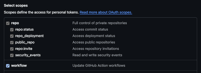 Authorization header. The Authorization header value is a valid GitHub personal access token with repository permissions combined like so token <GH_PERSONAL_ACCESS_TOKEN> where <GH_PERSONAL_ACCESS_TOKEN> is the personal access token generated on GitHub. For example if you had an access token ghp_zWAdtUqmtFTY7qkqJS1wmuEx8ytX0SpIPv then the Authorization header would be set like so token ghp_zWAdtUqmtFTY7qkqJS1wmuEx8ytX0SpIPv. Please refer to the following GitHub documentation on how to generate an access token.