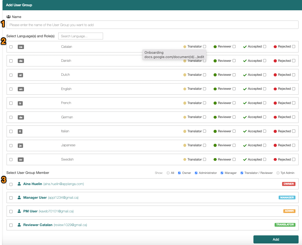 A user with the Manager role can only add or remove users with the Translator/Reviewer role to a User Group.