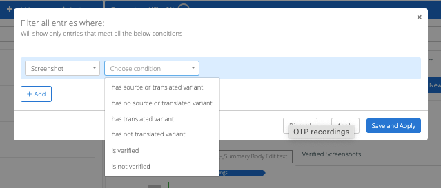 - Screenshot allows users to filter strings that are linked to a source or translated screenshot, a source or translated variant, and screenshots that are verified or unverified